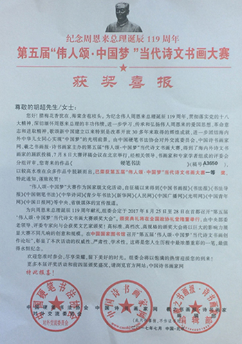 我局胡超书法作品荣获第五届“伟人颂·中国梦”当代诗文书画大赛一等奖