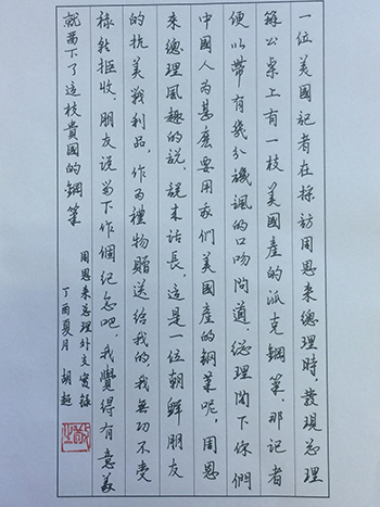 文章来源:天下韶山网 作者:胡超 时间:2017-07-21 17:32:25天下韶山网讯(作者 胡超)腊梅花香今犹在,海棠含苞立枝头。为纪念周恩来总理诞辰119周年,由中国硬笔书法协会、中国诗书画家网、羲之书画报·诗书画家主办的第五届“伟人颂·中国梦”当代诗文书画大赛于7月在北京举行。