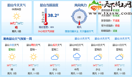 大家一定想知道,这样的炎热天气到底还要持续多久? 啥时候才能降温呢? 天下韶山网告诉您:跌破30℃,快了! 除了期待一场雨,您是不是和记者一样期待“秋”的早日到来呢? 明天,明天,明天就立秋啦! 7日晚-10日湖南自北向南有一次小到中雨过程,届时高温将得以暂时解除。8月9日,韶山气温要跌破30℃,最高温降到28℃,最低仅25℃,大家是不是有一种高兴到要飞起的感觉?