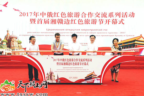 19日下午,活动开幕式在浏阳文家市镇秋收起义会师纪念广场举行。湖南省人大常委会党组书记、副主任韩永文出席开幕式并讲话,韩永文和国家旅游局红办常务副主任薛亚平、俄罗斯联邦旅游署驻北京办事处主任亚历山大·福尔科、俄罗斯“世界无国界”旅游协会执行经理皮季哈特卡·斯韦特兰娜、湖南省旅发委主任陈献春共同启动开幕式,中俄两国旅游部门领导、旅游行业嘉宾、有关国家部委局领导等500多人参与此次活动。